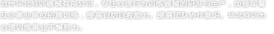 滄州華北特訓器械有限公司成立于2002年,是專業研發生產心理行為訓練器械、拓展器械、拓展器材、攀巖、兒童拓展器械的專業型企業,并通過ISO-9001質量管理體系認證及ISO-14001環境管理體系認證,致力于各職業群體提供的心理行為訓練器械、拓展器械、攀巖、兒童拓展器械等設備,使之不斷提升心理健康水平、充分開發自我潛能。我公司竭誠為廣大客戶提供專業化各類心理行為訓練器械相關產品和服務。